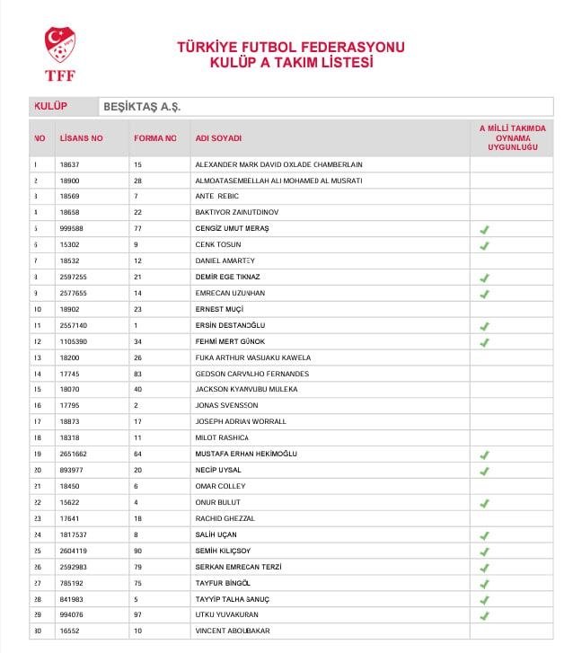 Beşiktaş’ın TFF’ye bildirdiği A takım listesinde yer alan futbolcular ise şöyle: