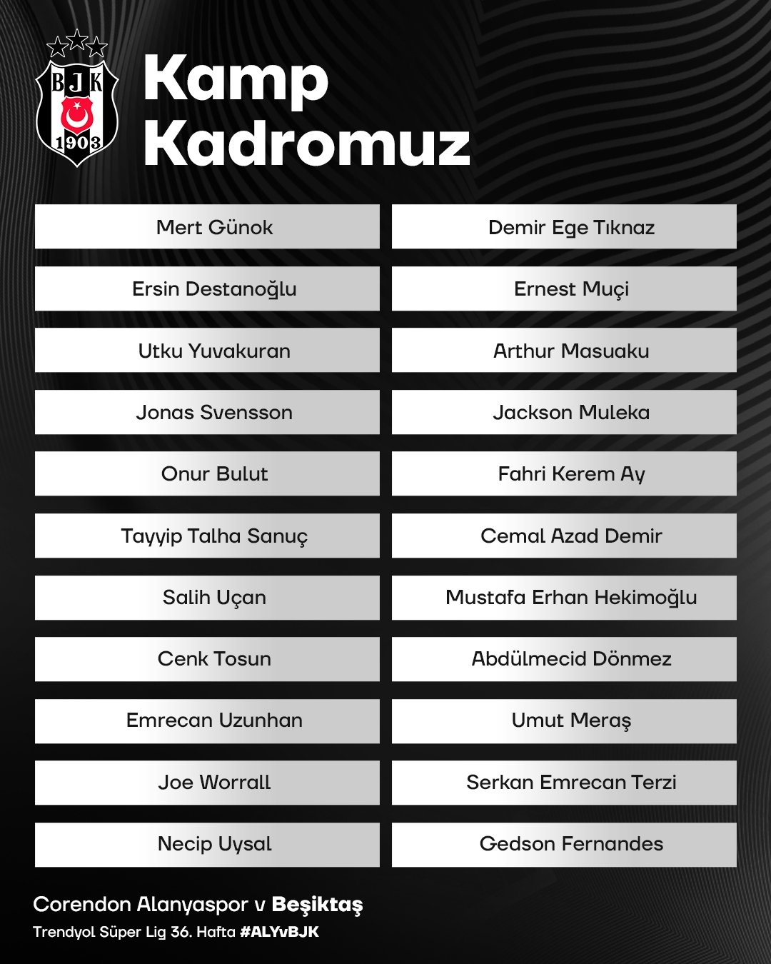 Trendyol Süper Lig’in 36. haftasında Beşiktaş, Corendon Alanyaspor ile deplasmanda karşı karşıya gelecek. Bu mücadele öncesi siyah-beyazlıların maç kafilesi açıklandı.