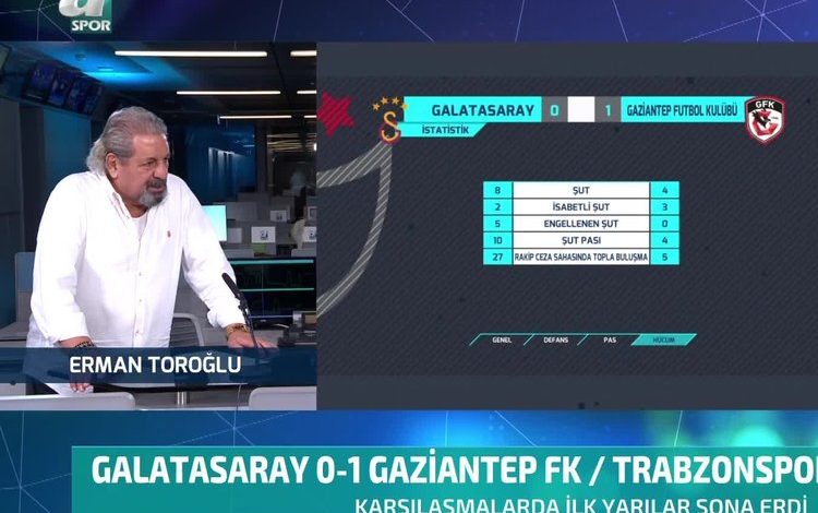 Trendyol Süper Lig’in 23. haftasında Galatasaray, Gaziantep FK ile karşı karşıya geldi. Mücadelenin ilk yarısı deplasman ekibinin 1-0’lık üstünlüğüyle sonuçlanırken A Spor yorumcusu Erman Toroğlu’nun sarı-kırmızılıların…Devamı için tıklayınız