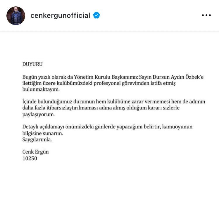 Cenk Ergün’den istifa açıklaması; “Bugün yazılı olarak da Yönetim Kurulu Başkanımız Sayın Dursun Aydın Özbek’e ilettiğim üzere kulübümüzdeki profesyonel görevimden istifa etmiş bulunmaktayım.