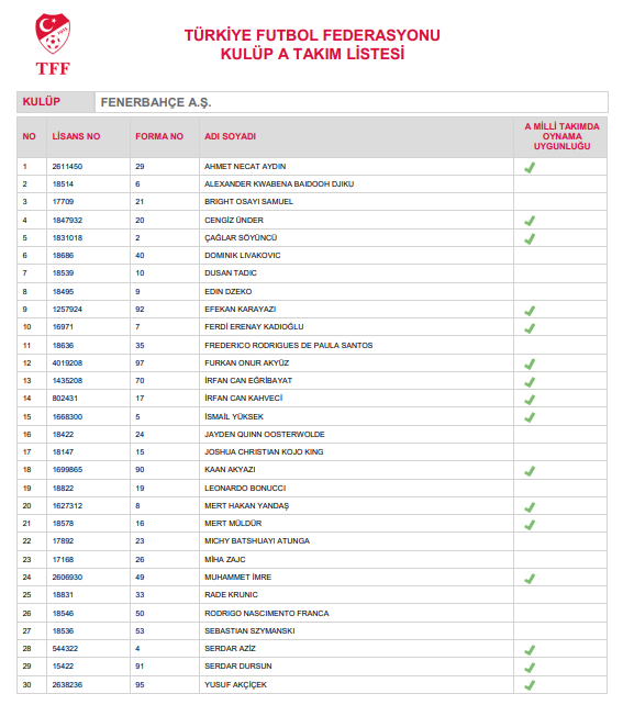 F.Bahçe’nin 30 kişilik A takım listesinde şu futbolcular bulunuyor: