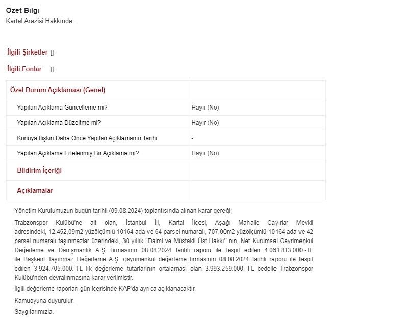 Trabzonspor Kulübü’ne ait olan, İstanbul İli, Kartal İlçesi, Aşağı Mahalle Çayırlar Mevkii adresindeki, 12.452,09m2 yüzölçümlü 10164 ada ve 64 parsel numaralı, 707,00m2 yüzölçümlü 10164 ada ve 42 parsel numaralı taşınmazlar üzerindeki, 30 yıllık “Daimi ve Müstakil Üst Hakkı” nın, Net Kurumsal Gayrimenkul Değerleme ve Danışmanlık A.Ş. firmasının 08.08.2024 tarihli raporu ile tespit edilen 4.061.813.000.-TL ile Başkent Taşınmaz Değerleme A.Ş. gayrimenkul değerleme firmasının 08.08.2024 tarihli raporu ile tespit edilen 3.924.705.000.-TL lik değerleme tutarlarının ortalaması olan 3.993.259.000.-TL bedelle Trabzonspor Kulübü’nden devralınmasına karar verilmiştir. İlgili değerleme raporları gün içerisinde KAP’da ayrıca açıklanacaktır.” denildi.