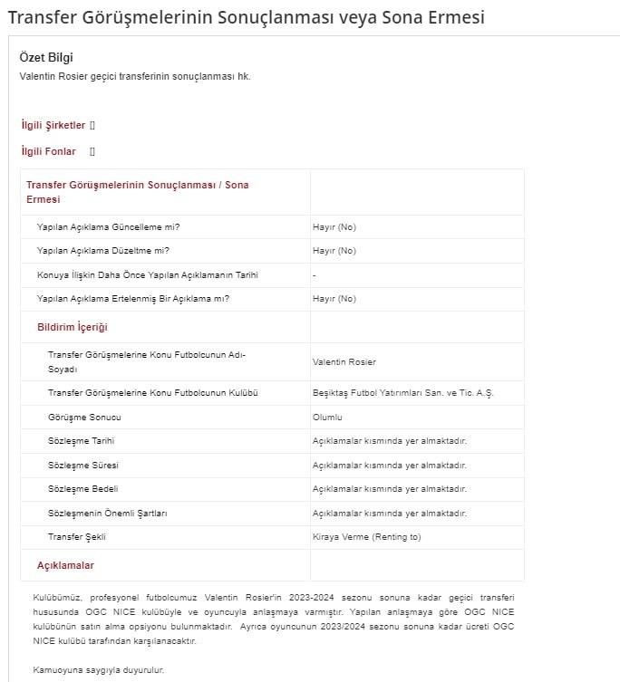 Yapılan açıklamada, “Kulübümüz, profesyonel futbolcumuz Valentin Rosier’in 2023-2024 sezonu sonuna kadar geçici transferi hususunda OGC NICE kulübüyle ve oyuncuyla anlaşmaya varmıştır. Yapılan anlaşmaya göre OGC NICE kulübünün satın alma opsiyonu bulunmaktadır. Ayrıca oyuncunun 2023/2024 sezonu sonuna kadar ücreti OGC NICE kulübü tarafından karşılanacaktır. Kamuoyuna saygıyla duyurulur.” denildi.